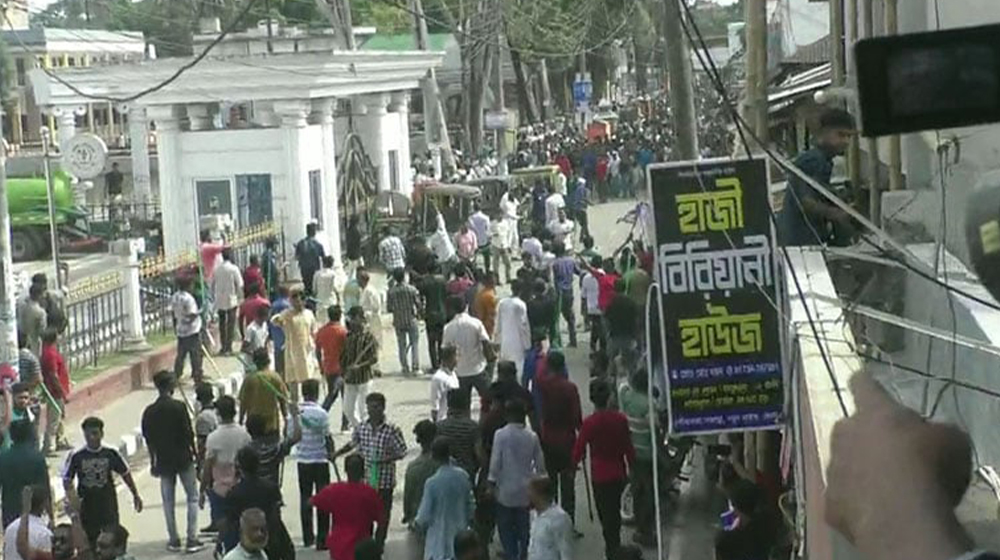 নির্বাচন বিলম্বিত ও বানচালের ষড়যন্ত্রের প্রতিবাদে পূর্ব ঘোষণা অনুযায়ী বিএনপি দুপুর সাড়ে ১২টায় মহাজনপট্টি দলীয় কার্যালয় থেকে মিছিল বের করে। মিছিলটি সদর রোড, বাংলাস্কুল মোড় ঘুরে নতুন বাজার প্রবেশ করলে দুই দলের নেতাকর্মীদের মধ্যে ধাওয়া পাল্টা ধাওয়া ও ইটপাটকেল নিক্ষপের ঘটনা ঘটে। এতে পুলিশ, গণমাধ্যমকর্মীসহ অন্তত ৫০ জন আহত হয়েছেন। ভাঙচুর করা হয়েছে গাড়ি ও বিজেপি অফিস বেশ কিছু আসবাবপত্র। পুলিশ এসে পরিস্থিতি নিয়ন্ত্রণে আনে। রাস্তার পাশের কয়েকটি মোটরসাইকেল ভাঙচুর করা হয়।